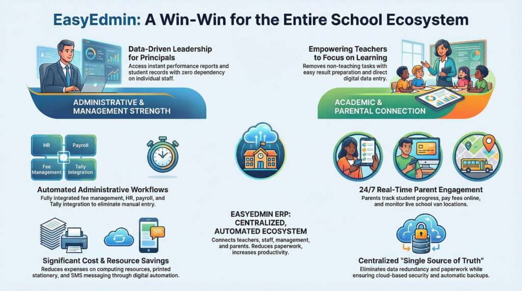 EasyEdmin benefits every stakeholder in the institution. Teachers can manage attendance, marks, and communication efficiently. Computer and administrative staff experience reduced manual work and improved accuracy through automation. Principals and management gain real-time reports and better decision-making insights. Parents stay informed with timely updates on academics, fees, and important announcements.